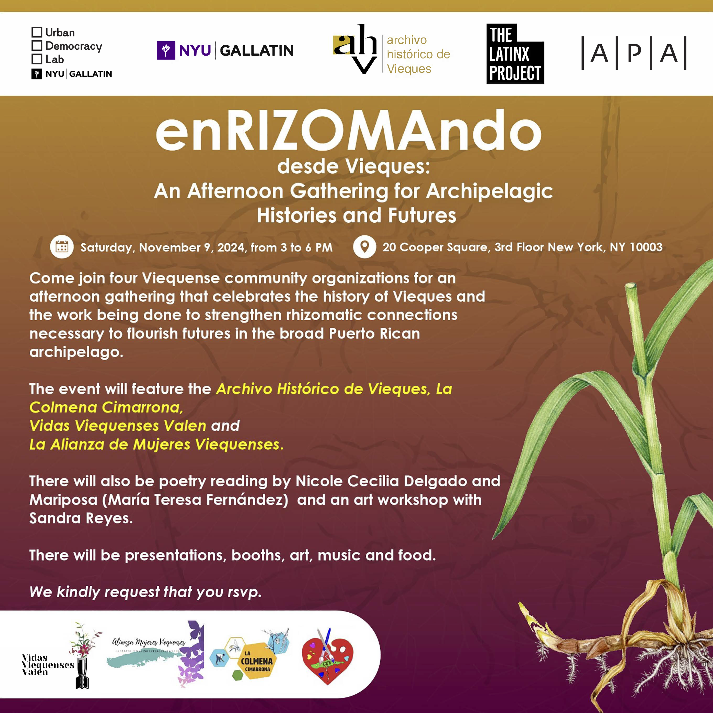 Come join four Viequense community organizations for an afternoon gathering that celebrates the history of Vieques and the work being done to strengthen rhizomatic connections necessary to flourish futures in the broad Puerto Rican archipelago. This event follows the Friday, November 8 panel “Radical Sovereignties, Radical Archives.”