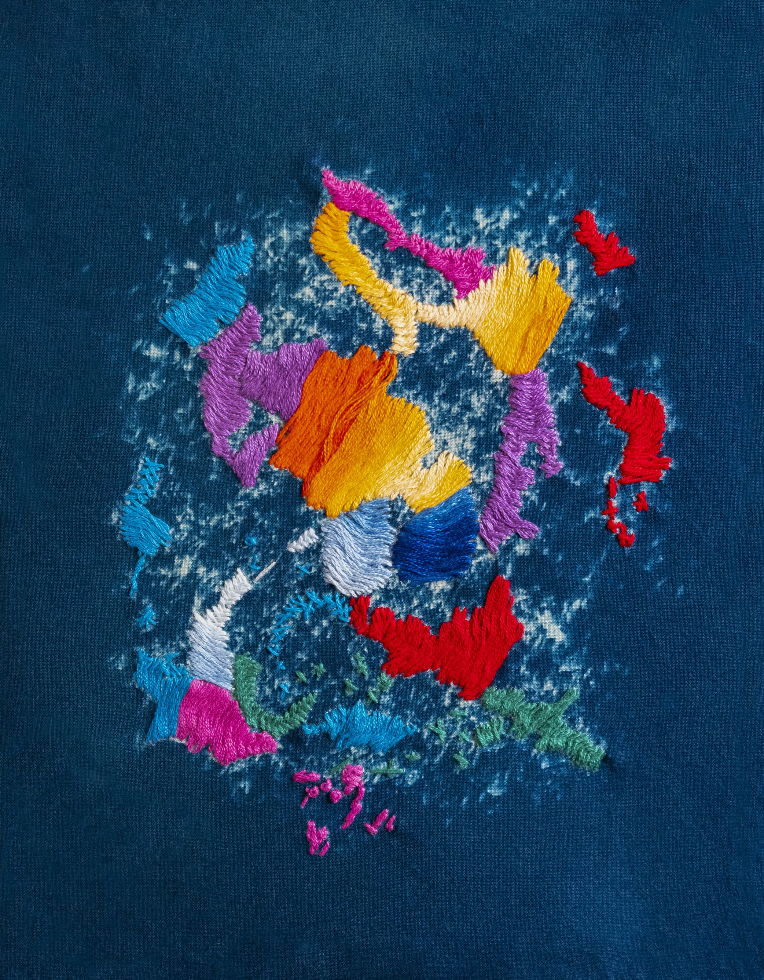 Hand-embroidered cyanotype on cotton fabric, made with pipicha seeds and dried leaves (a native Mexican herb)