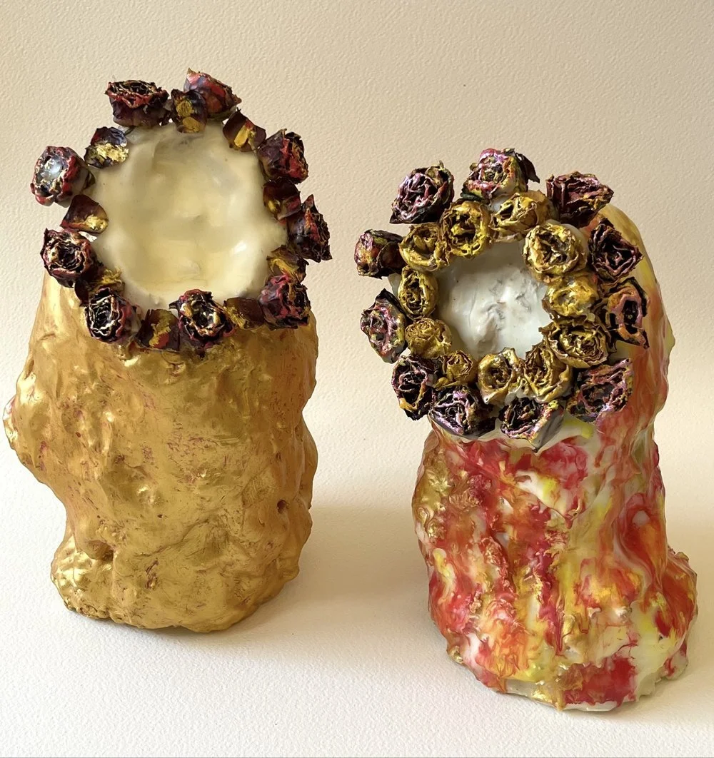 That same night Chong recalled she couldn't sleep after listening to Tío Eddie’s words. So she got her empty water bottle, swaddled it with plaster gauze, took it to school, and dipped it in encaustic. And, as her friends joke, that was how her first baby was born. She kept carrying them on her back around Parsons. Ecuadorian mothers have the tradition of carrying their children on their backs.