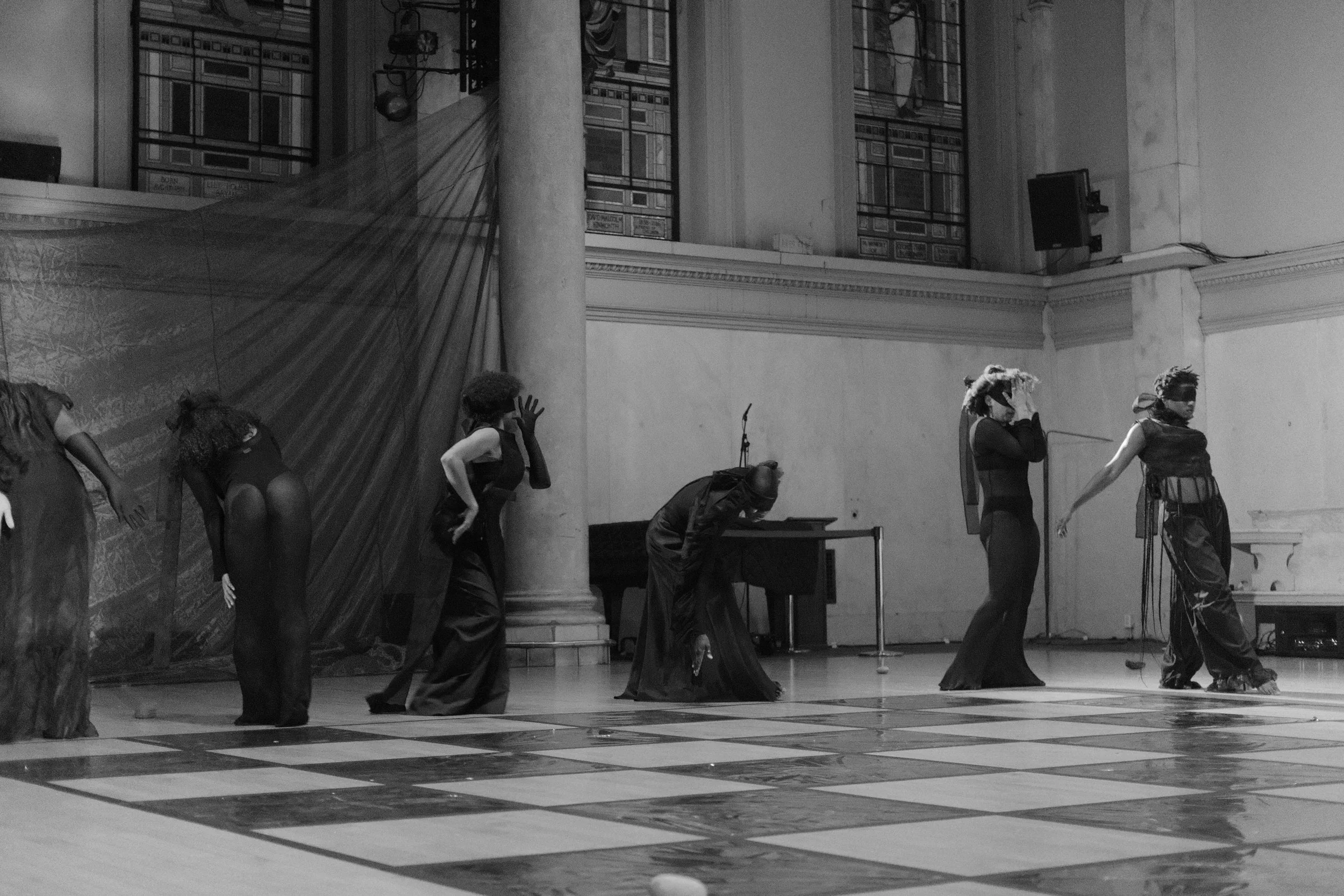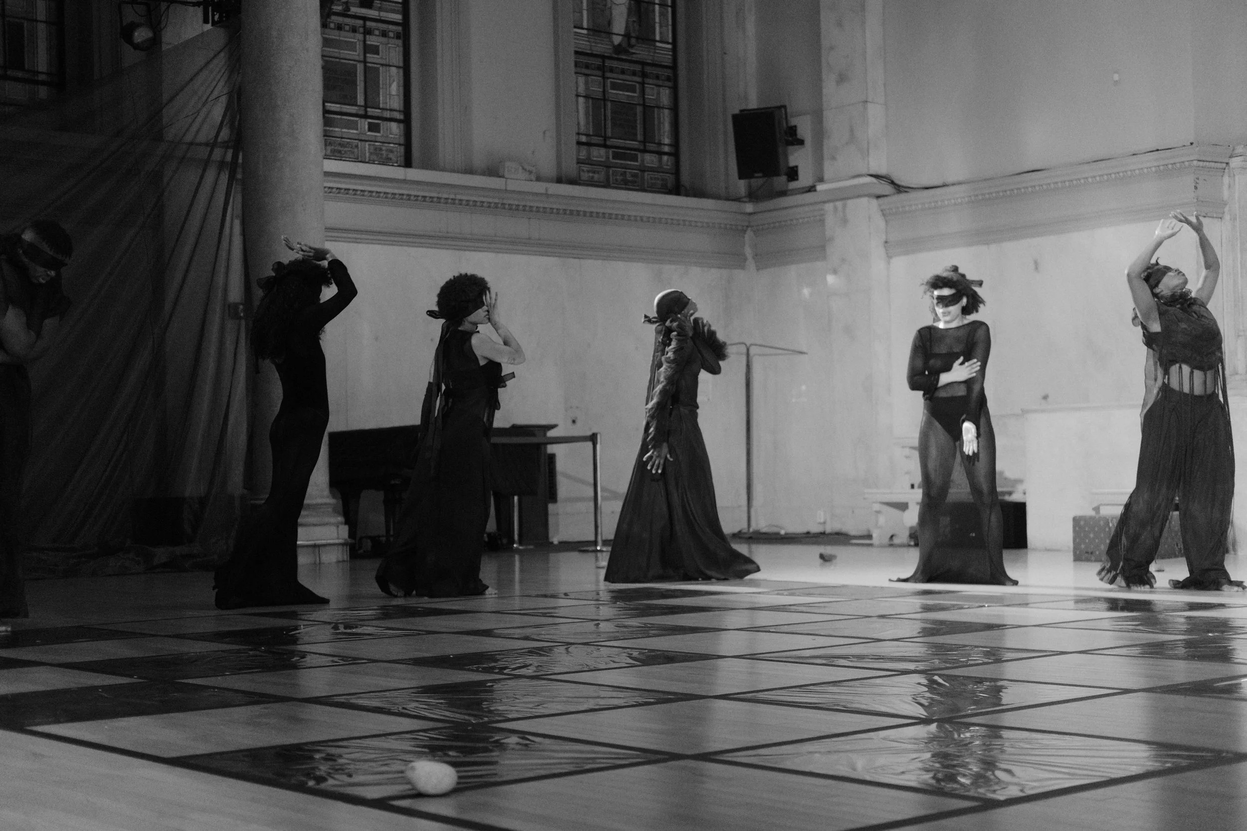Five other performers enter the space, also dressed in black sheer fabric, blindfolded, and holding rocks. They spin slowly and evenly, their movements deliberate. Suddenly—bang! Two rocks crash onto the wooden floor. The group orbits the room like planets, simultaneously rotating on their own axes. Their bodies breathe loudly, exhaling in forceful sh sounds, filling the room with a rhythm both primal and mechanical. The choreography is minimal yet intense—precisely measured, unwavering. The performers seem like tall towering ancestral guardians, enacting a ritual to guard the space—like open-mouthed gargoyles stationed at the entrance of a temple. The faint sound of water droplets filters into the space. Time loosens. The weight of my long day lifts away. I feel submerged in something dreamlike, trapped inside the subconscious.