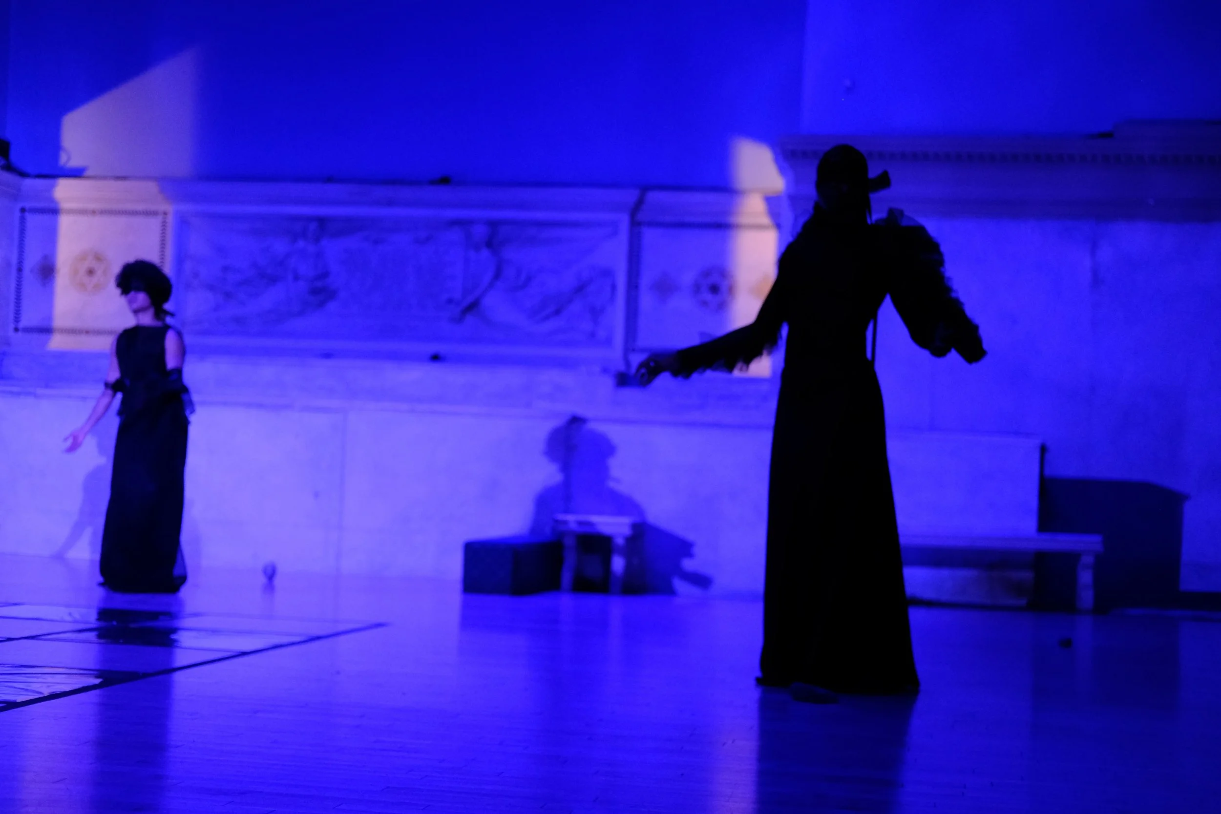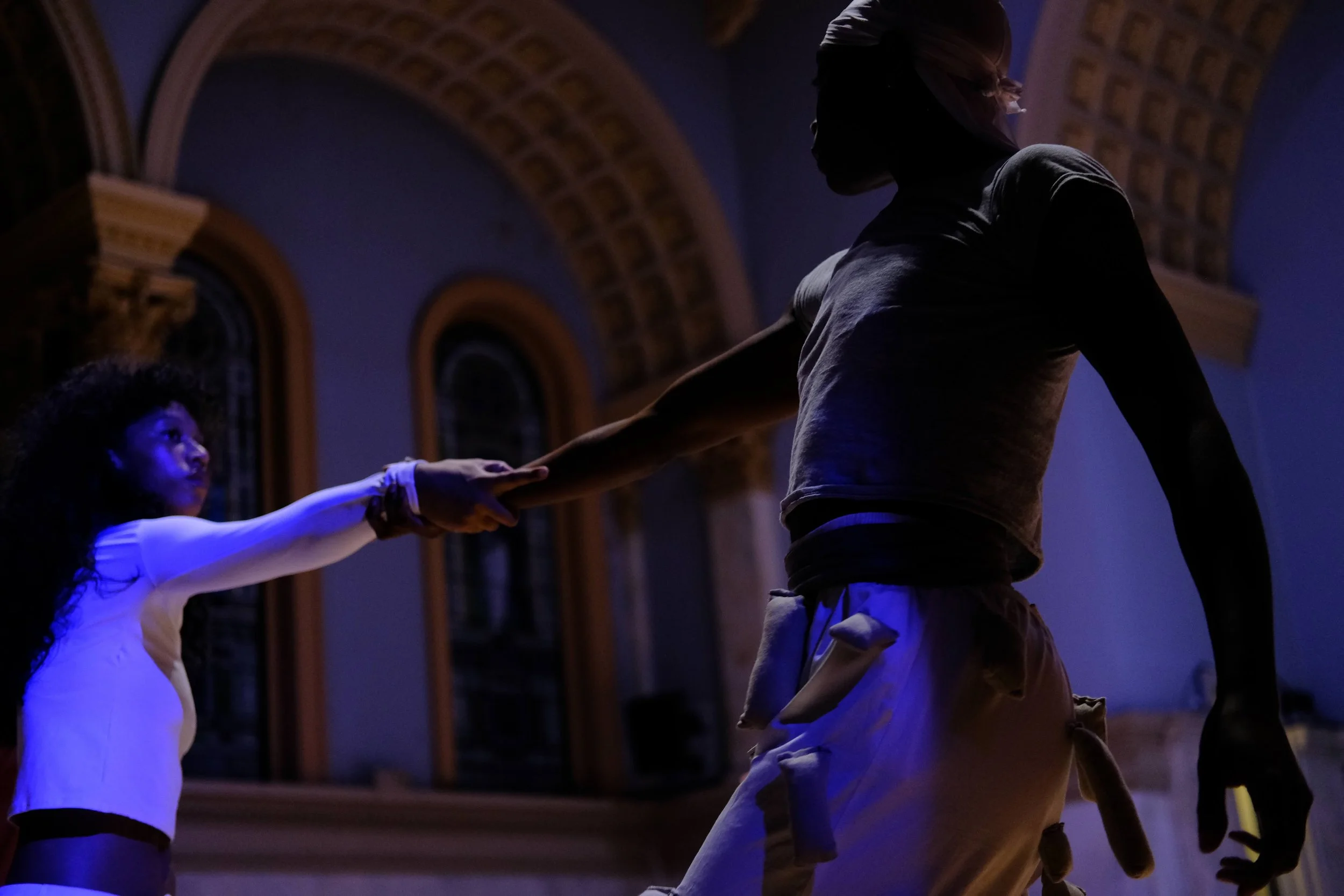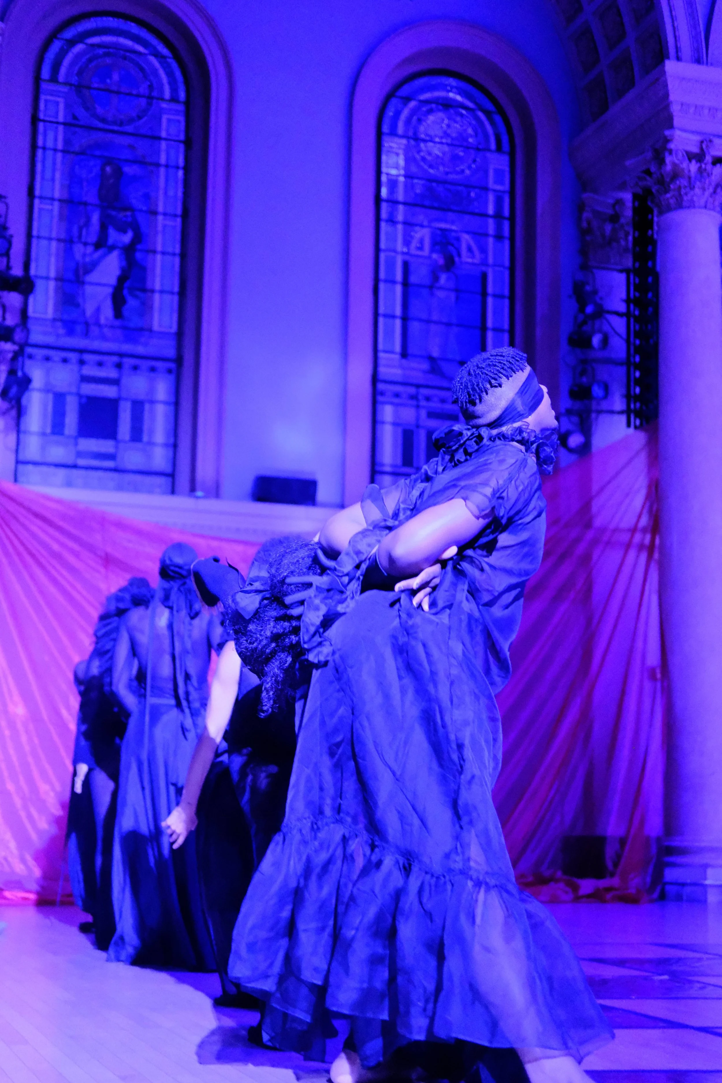 Just before the nighttime performance starts, the lights dim and the room falls silent. At the altar, Villa stands with their back to the audience, headphones on, body swaying gently side to side to music only they can hear. A purple-blue light washes over the church’s wooden floors, casting an otherworldly glow. Slowly, Villa sheds an everyday T-shirt and pants, stepping into a long, black sheer dress. The transformation ends with one last gesture—a blindfold tied across their eyes and a rock gripped in each hand. With a decisive clink of stone against stone overhead, the performance begins.