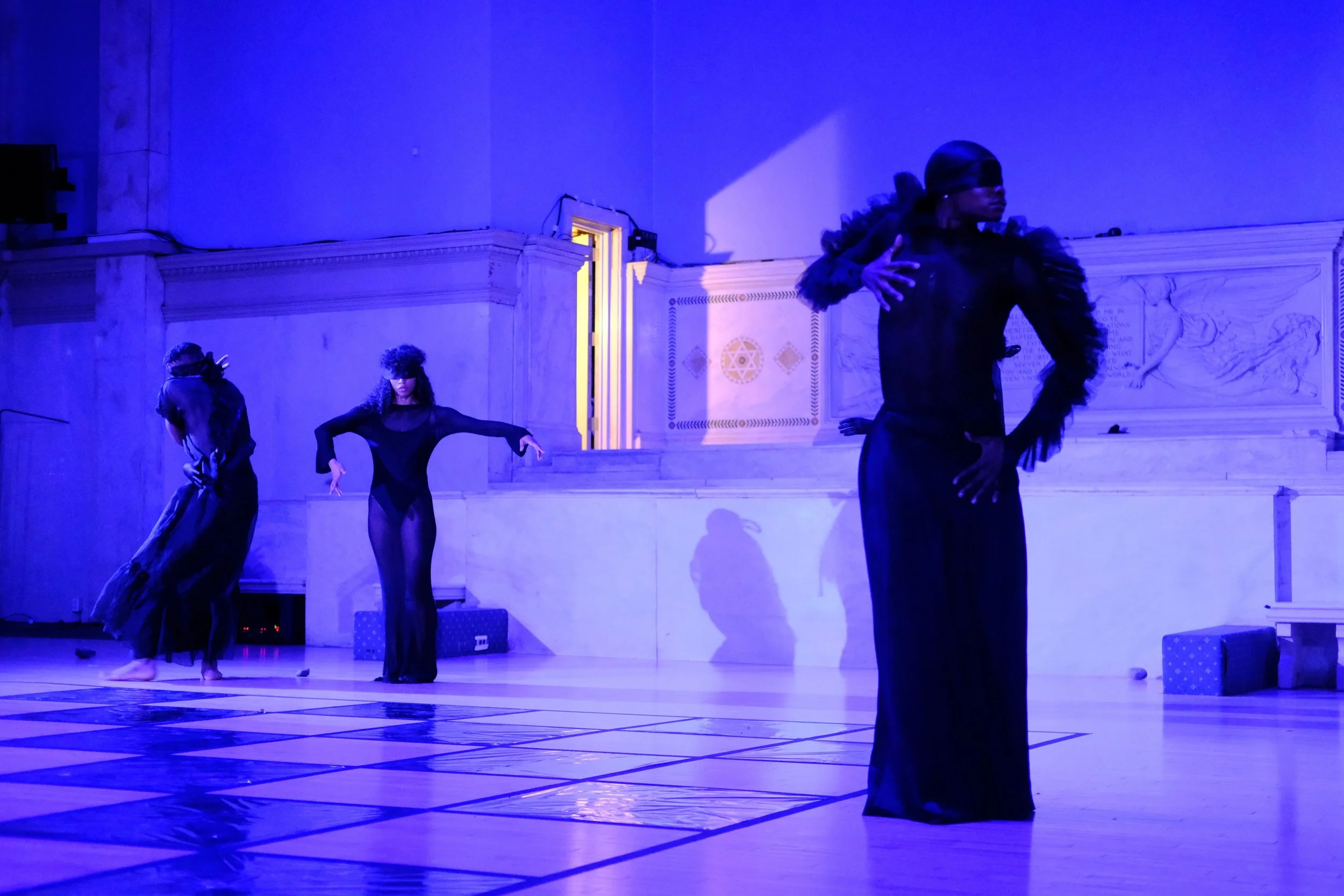 At the center of the checkered floor, Villa moves with outstretched arms, shadowed by another performer behind them, repeating each gesture exactly. The figure behind falls somewhere between a double and their shadow self. The performance felt like being underwater, caught between the subconscious and the ocean world. After the performance, Villa elaborates the title of the performance that echoes this sensation. “It is a declaration or statement about being the energy that is in all of us,” they say. “Swimming can be taken literally, and there's that tie. I’m fascinated by water. It's a really powerful element. I question what does it mean to swim in general? And to be fully submerged in something that alters your vision, your hearing, your senses as a whole. I’m stating that I am submerged in the Spirit that's with me.”