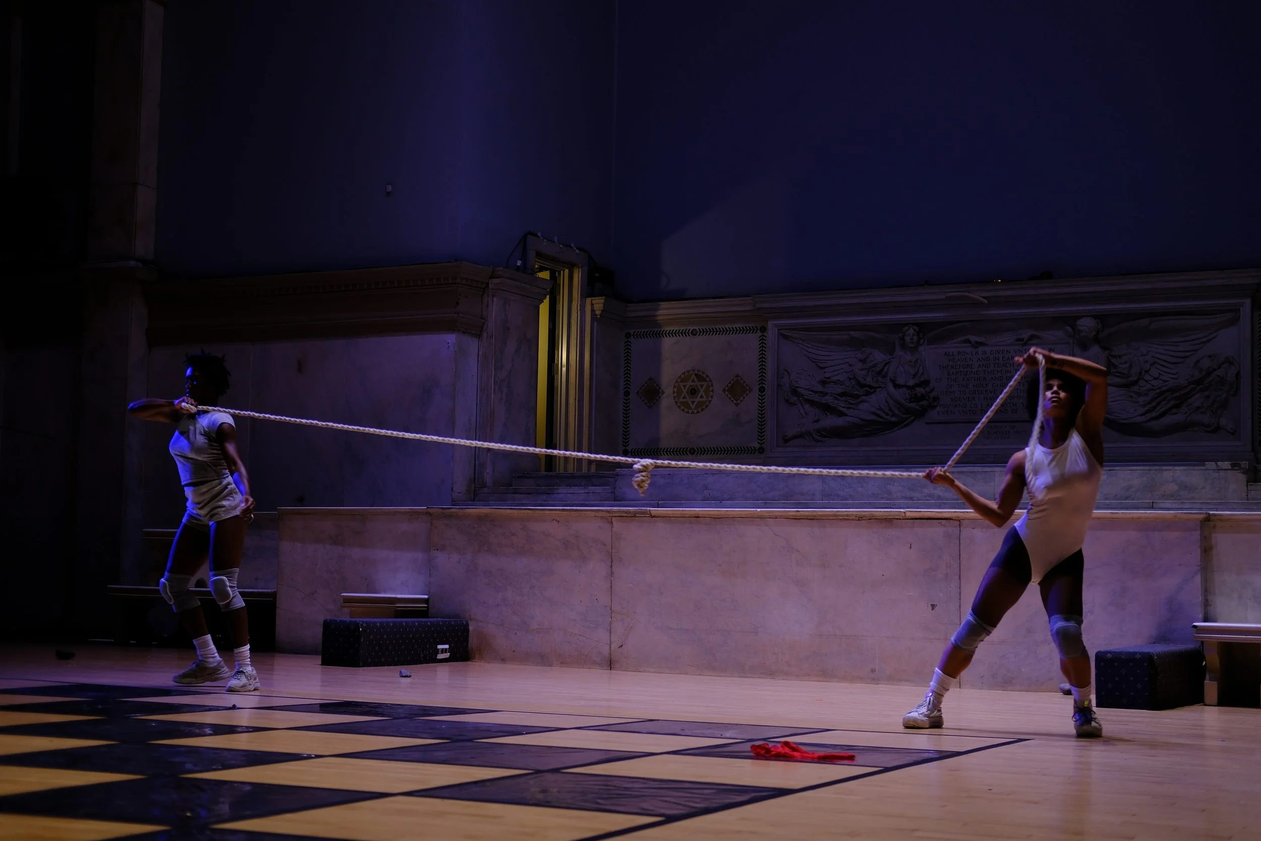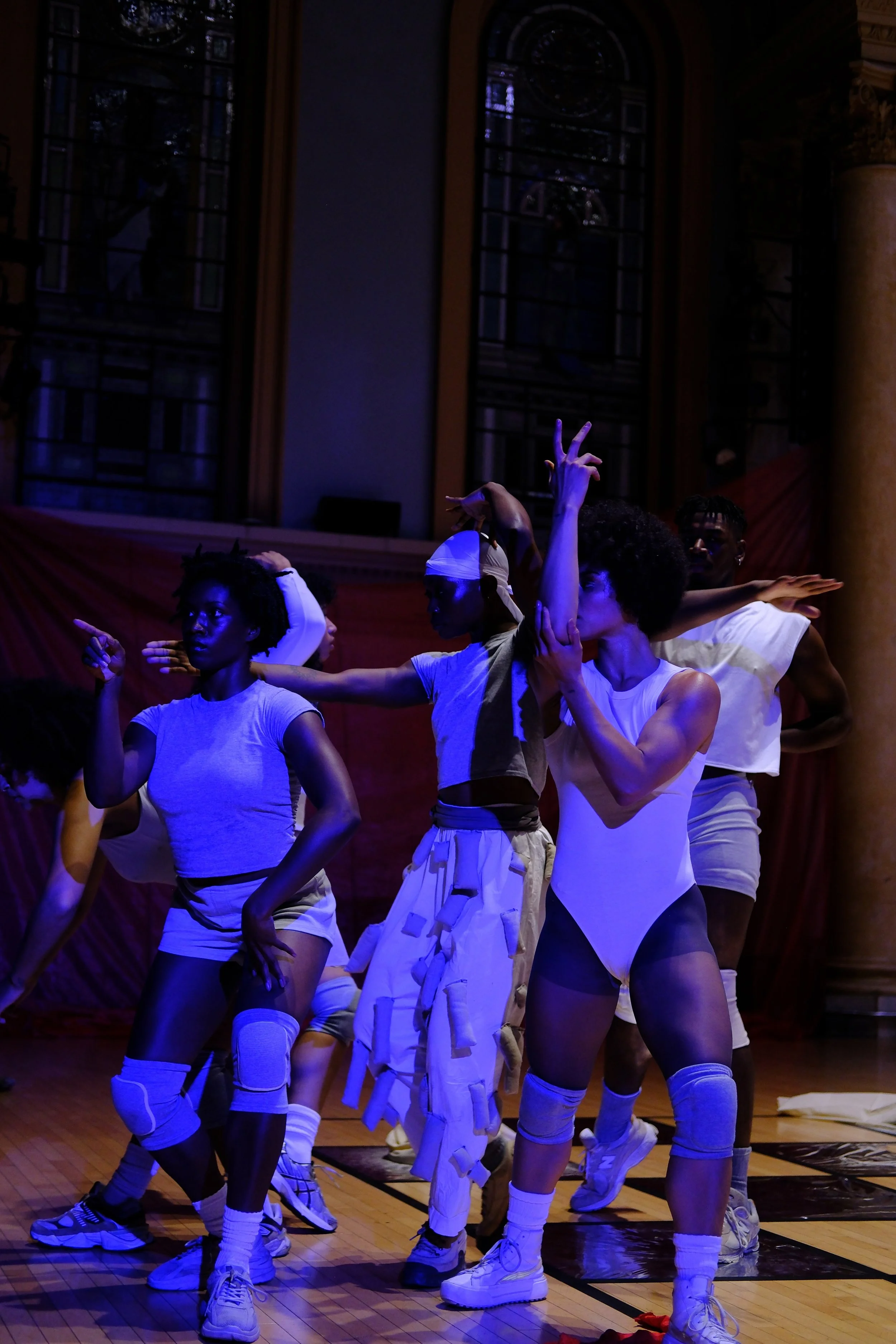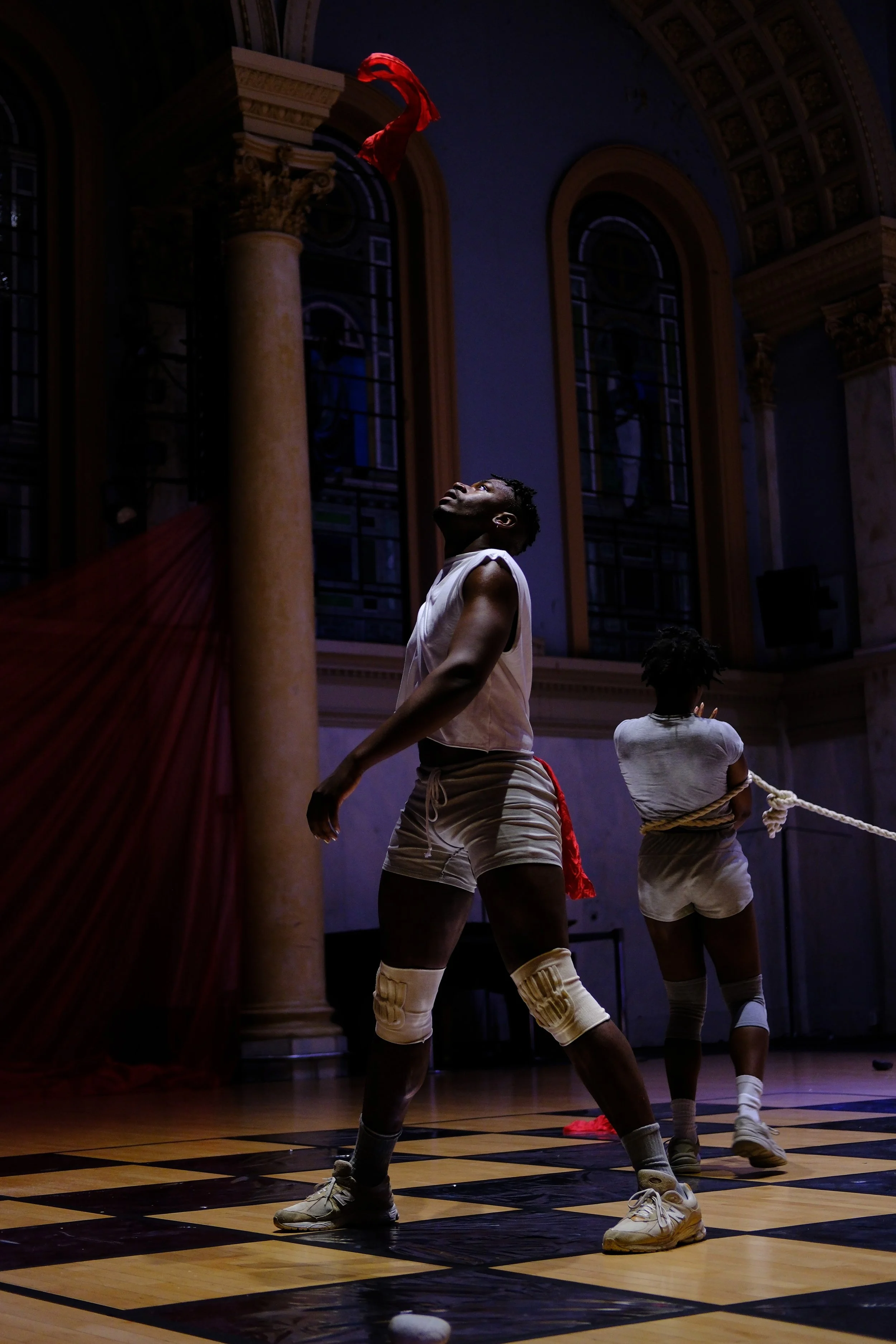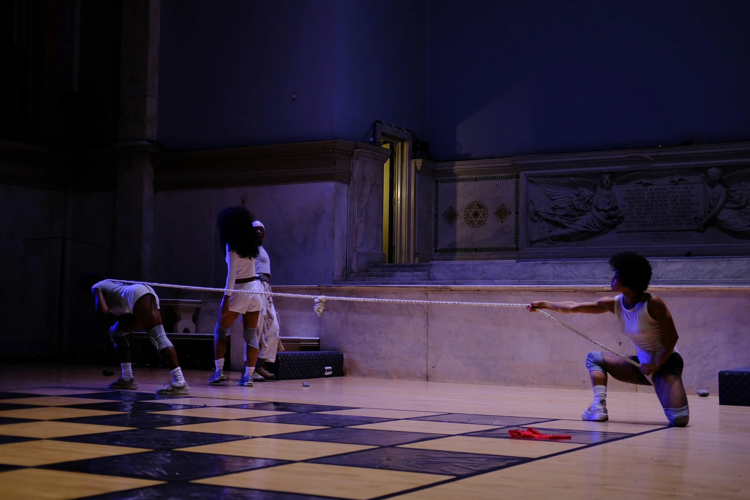 “This scene is completely about labor and work,” Villa shares. “The idea was for everyone to have different characters. I am imagining myself with the sandbags as time, like an hourglass time. dorchel and Mikaela, who have one rope, are characters of tension. Ny and Benin are exploring weight, giving and receiving weight, carrying weight. And Maleek with the red scarf, is completely embodying fluidity. All of these elements together feel like anchors and elements of work and what we work towards together in transformation.”
