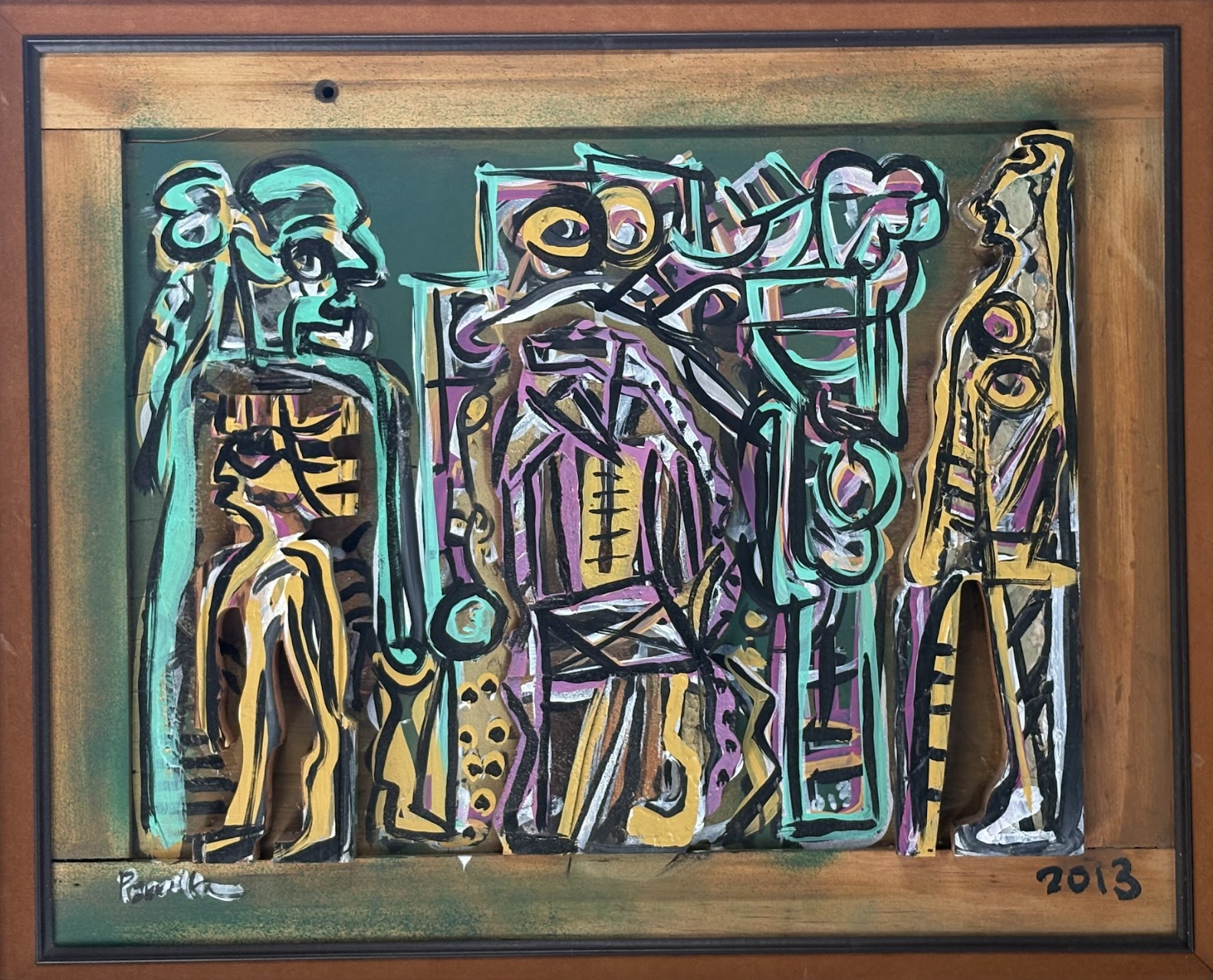 Earth to Paradise is a poignant wood relief assemblage that Parrilla Mena began during a period of intense personal loss. “My father had passed away, and I was meditating on death as a transition within consciousness and beyond,” he says. Meditation becomes the work’s organizing principle. Rather than depicting grief as an inward collapse, the assemblage externalizes mourning into a constructed environment: Figures are arranged like actors on a stage, their flattened, emblematic forms emphasizing presence over individual detail. This economy of form allows each figure to function both as a portrait and as a universal archetype.