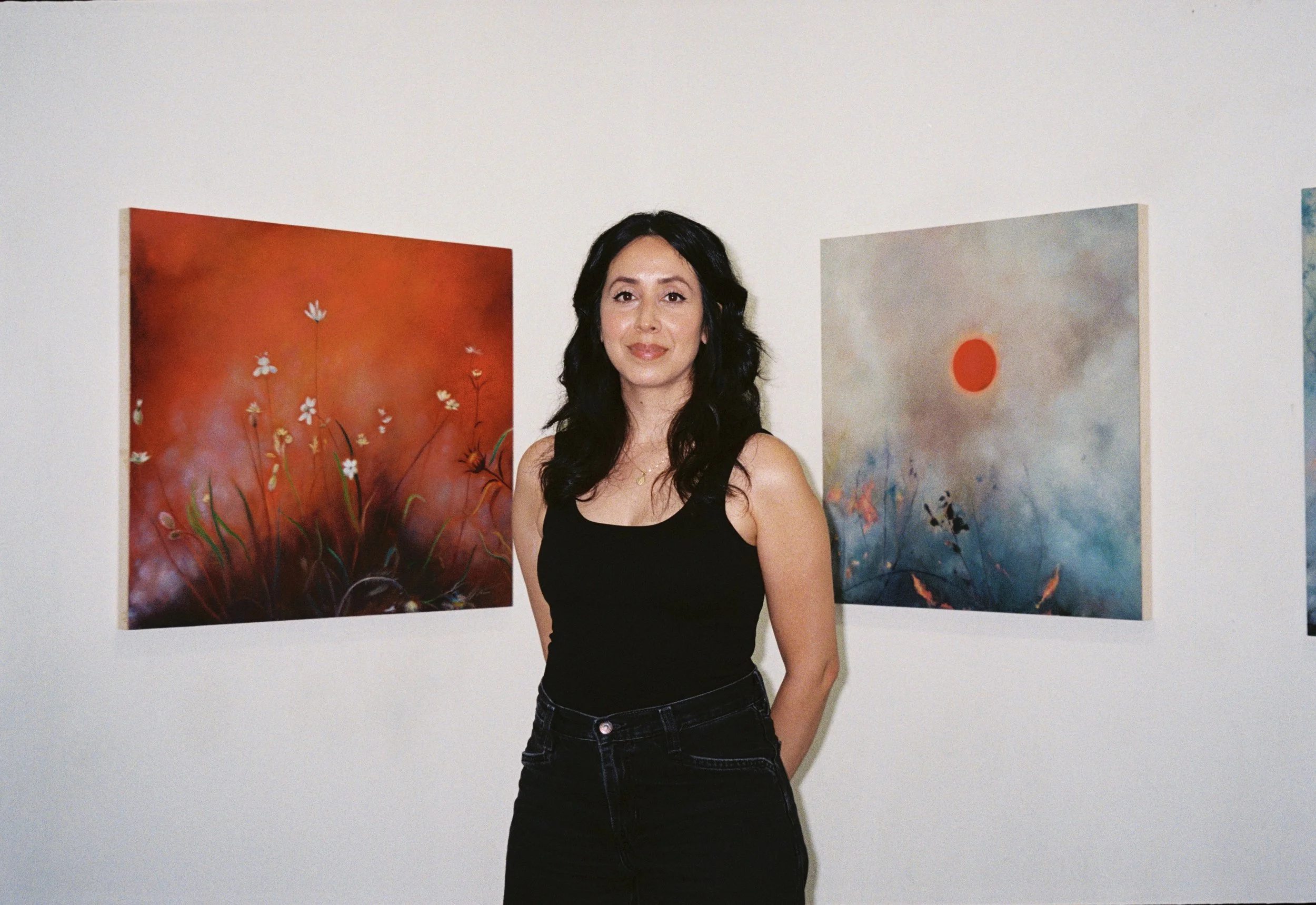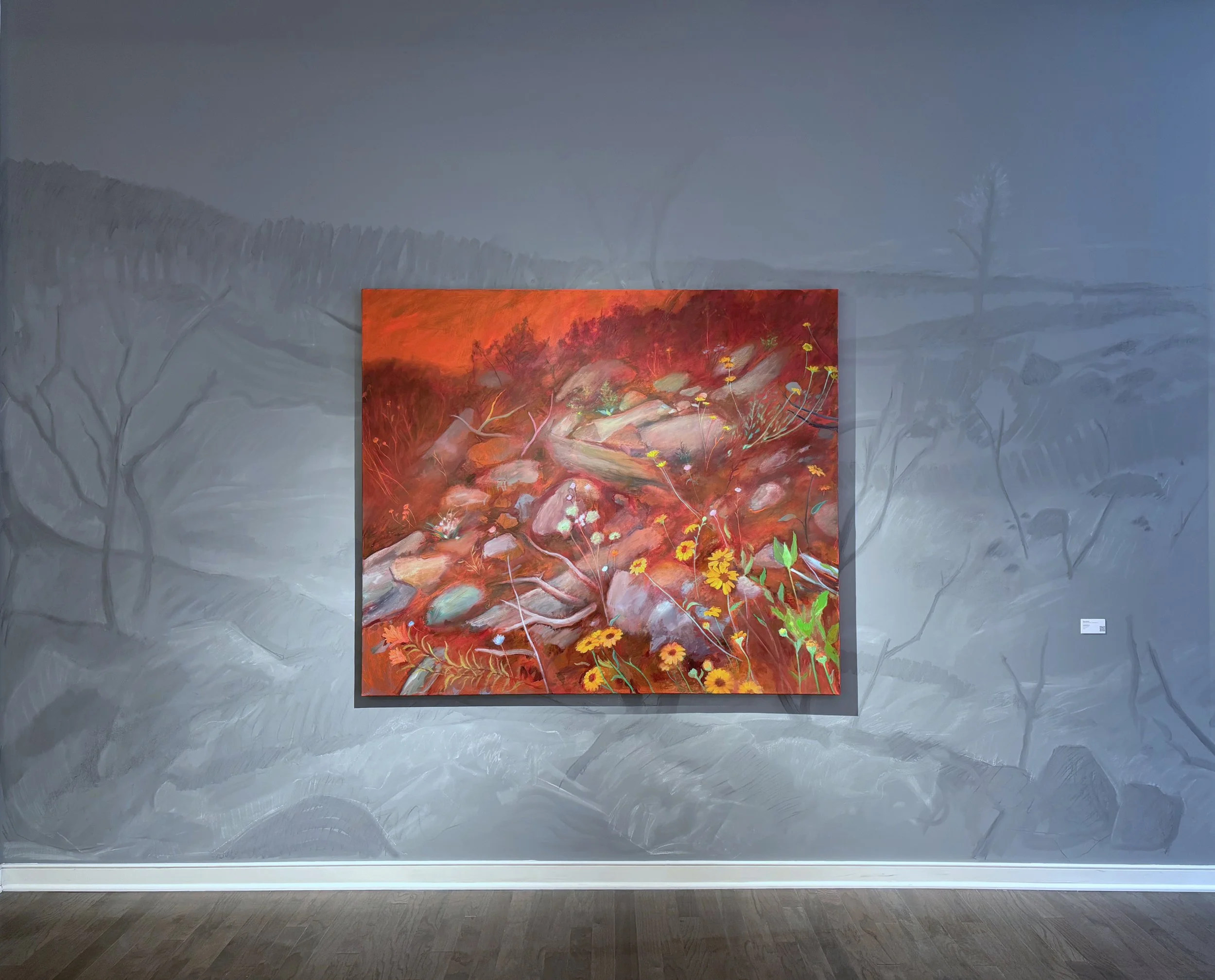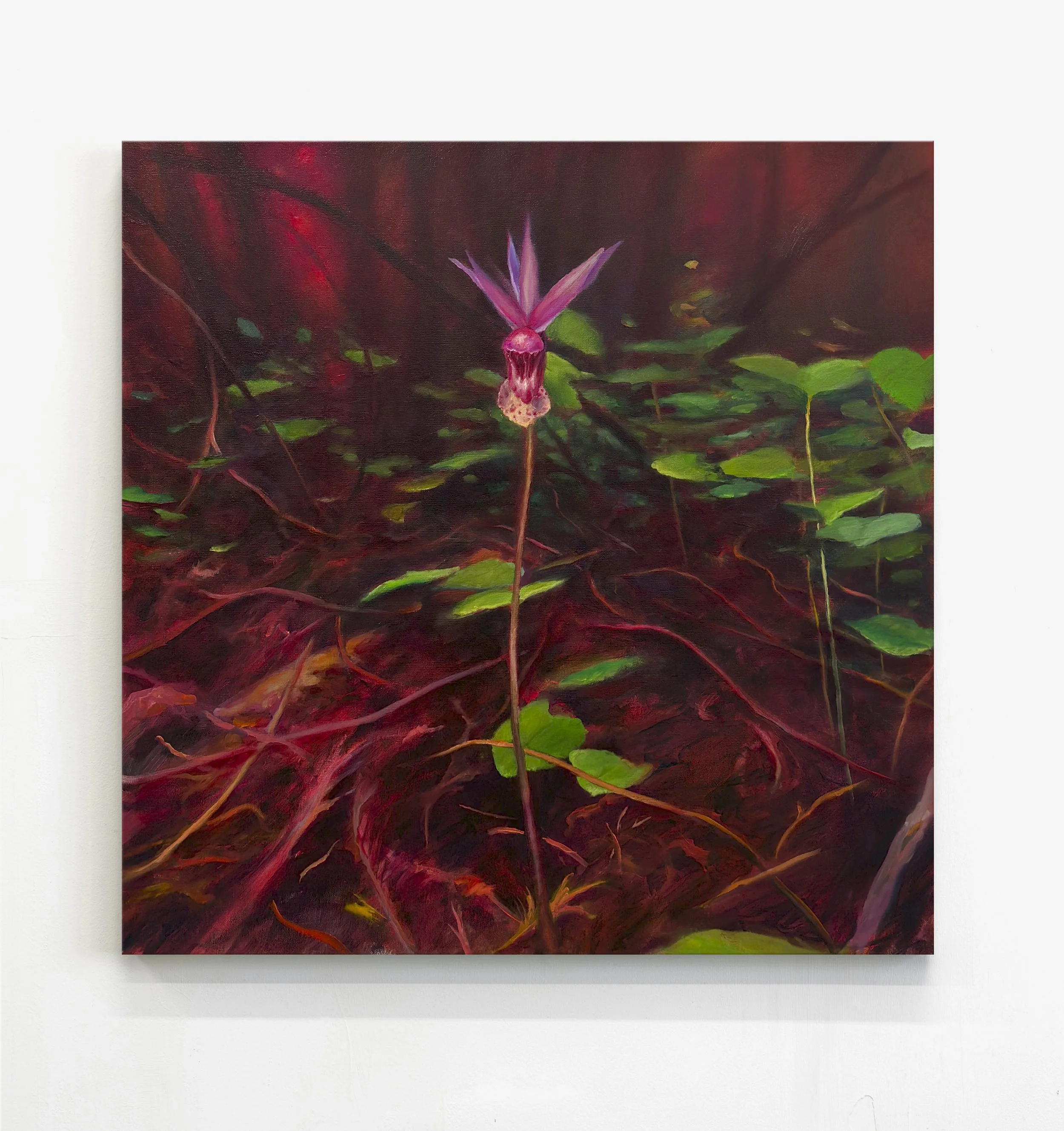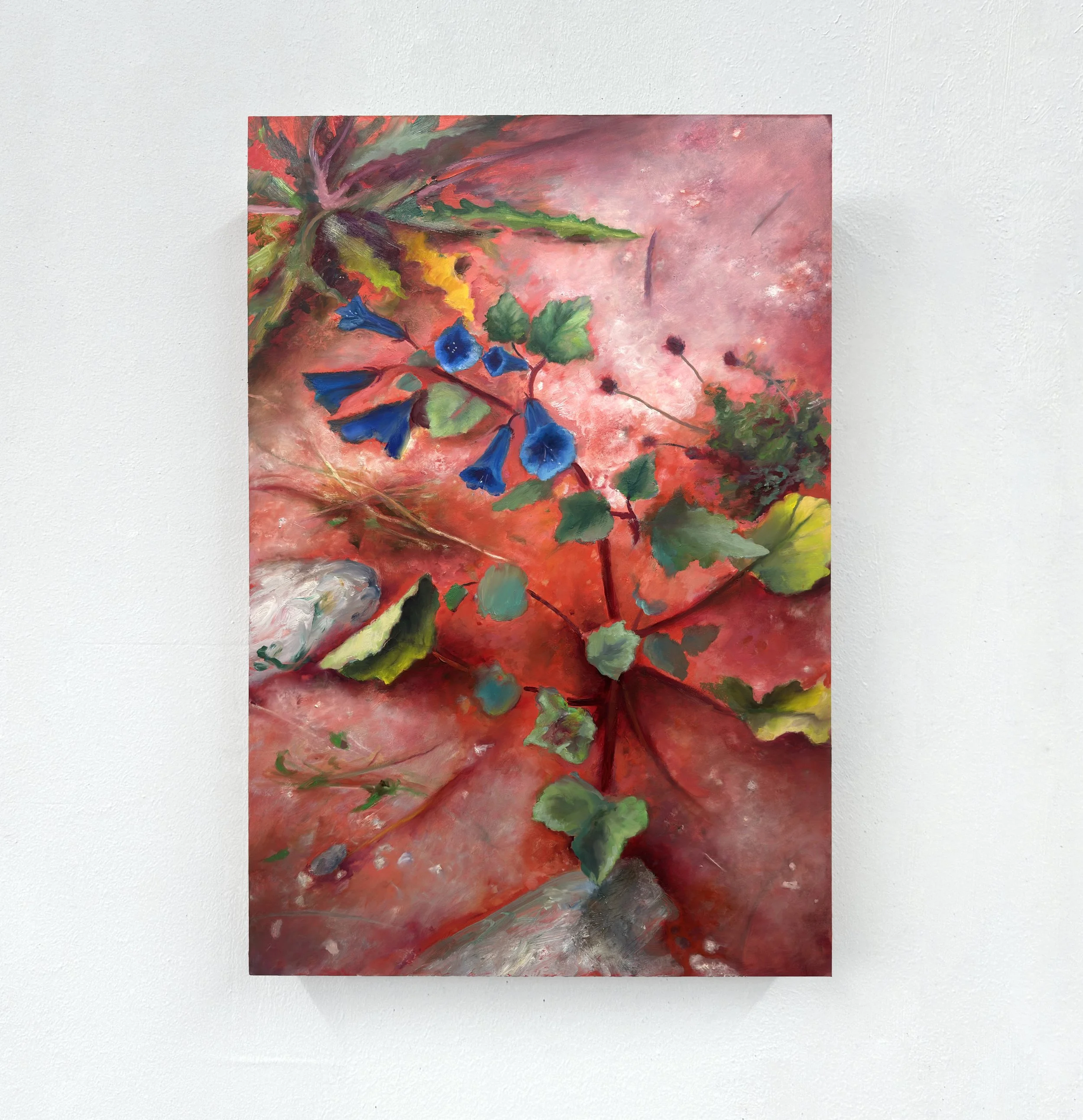 Muñoz’s renditions of these fire-following flowers are dynamic buds growing within red burnt atmospheres. Using panel, linen, and canvas surfaces, the paintings sway between definite and abstract, constructing dreamlike scenes of speculative ecologies. The leaf’s color spot in Fairy Slipper Orchid (2024) is meticulous, but in Rabbit Brush (2024) the flatness of the white branches are unsettling and wild. Most moments in the series are impressionistic and fluttery like the bells in Coyote Tobacco (2024) or highly saturated like in Desert Bluebell (2024).