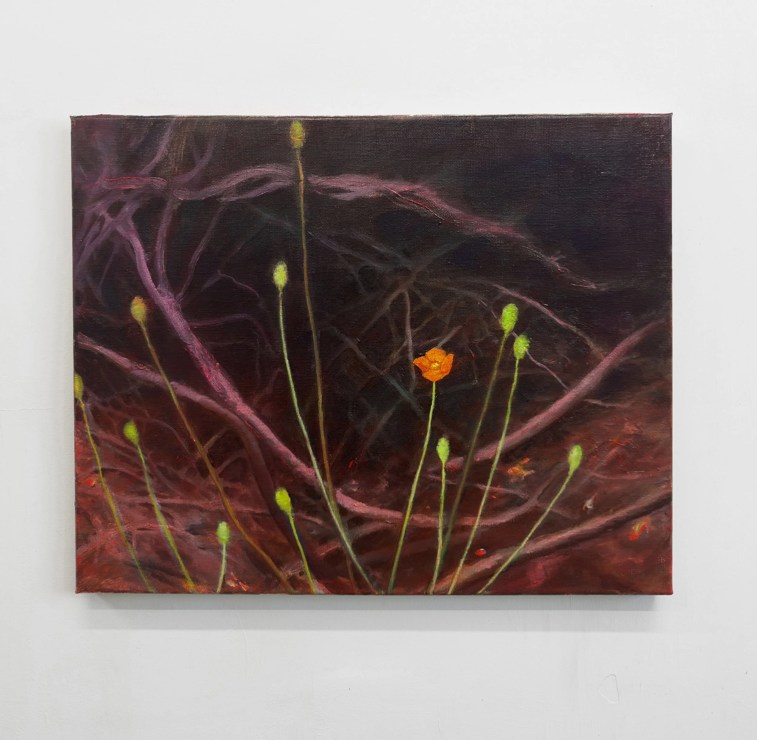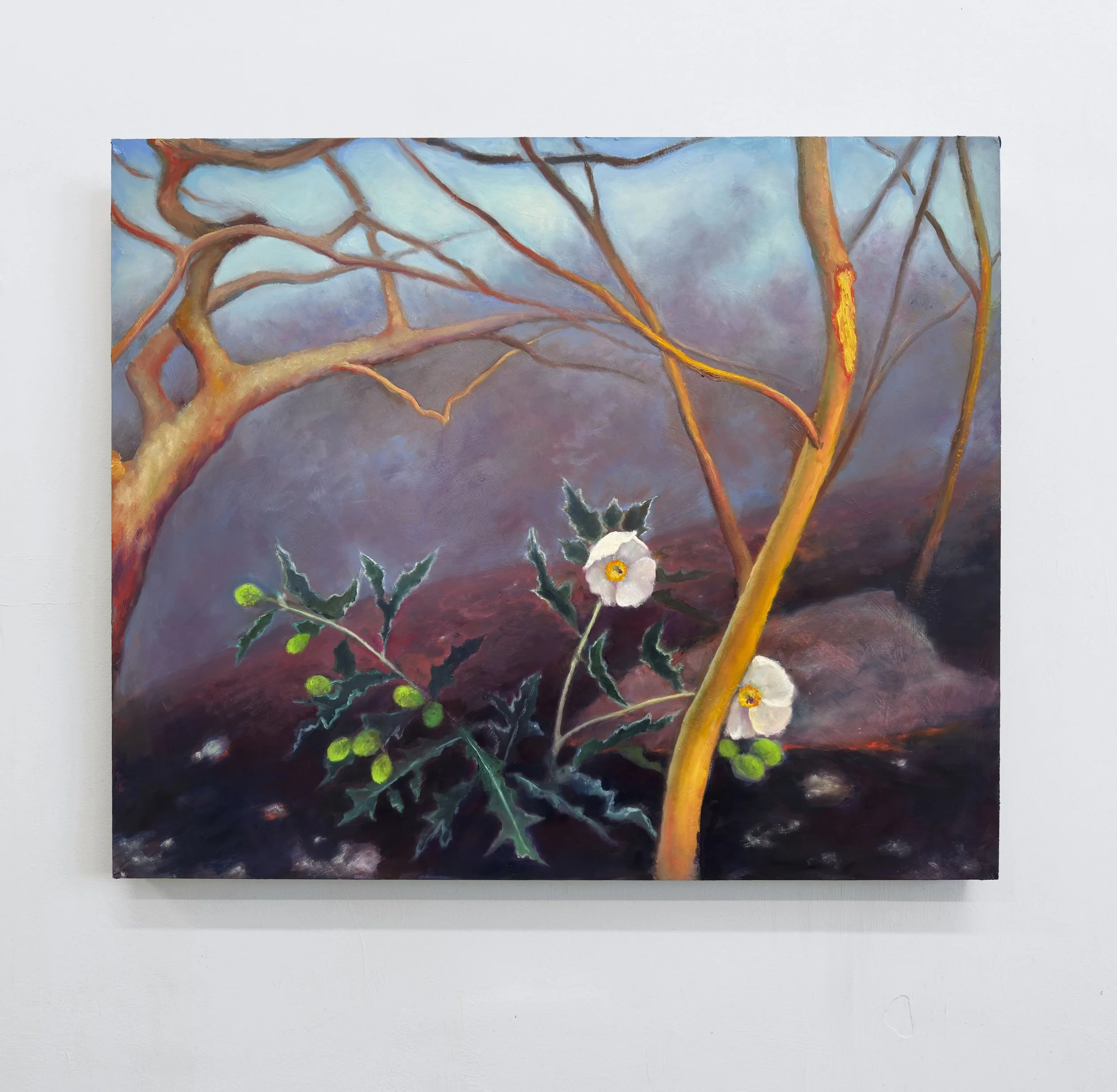 Formally trained in oil painting at Chicago’s American Academy of Art, Muñoz is currently more concerned with the vulnerability and agency of medium expansion rather than the mastery of realism. Taking notes from the macabre of Ivan Albright and the sublime of J. M. Turner, the history of (flower) painting is inherent and the urgency for floriography suspended. Muñoz offers to add honest associations to Indigenous plants as sights of beauty and complexity, taking them out of scientific colonial studies that pressed them in botanists’ journals. Perhaps the only formal symbolism apparent in the series is the poppies, such as in Fire Poppies (2024) and Prickly Poppy (2024); art history associates the poppy flower with war, sleep, resilience and death. And like all purist painters, Muñoz believes in how painting serves as a technology to raise consciousness, indoctrinate values, and, seditiously, to enter an exorcism.