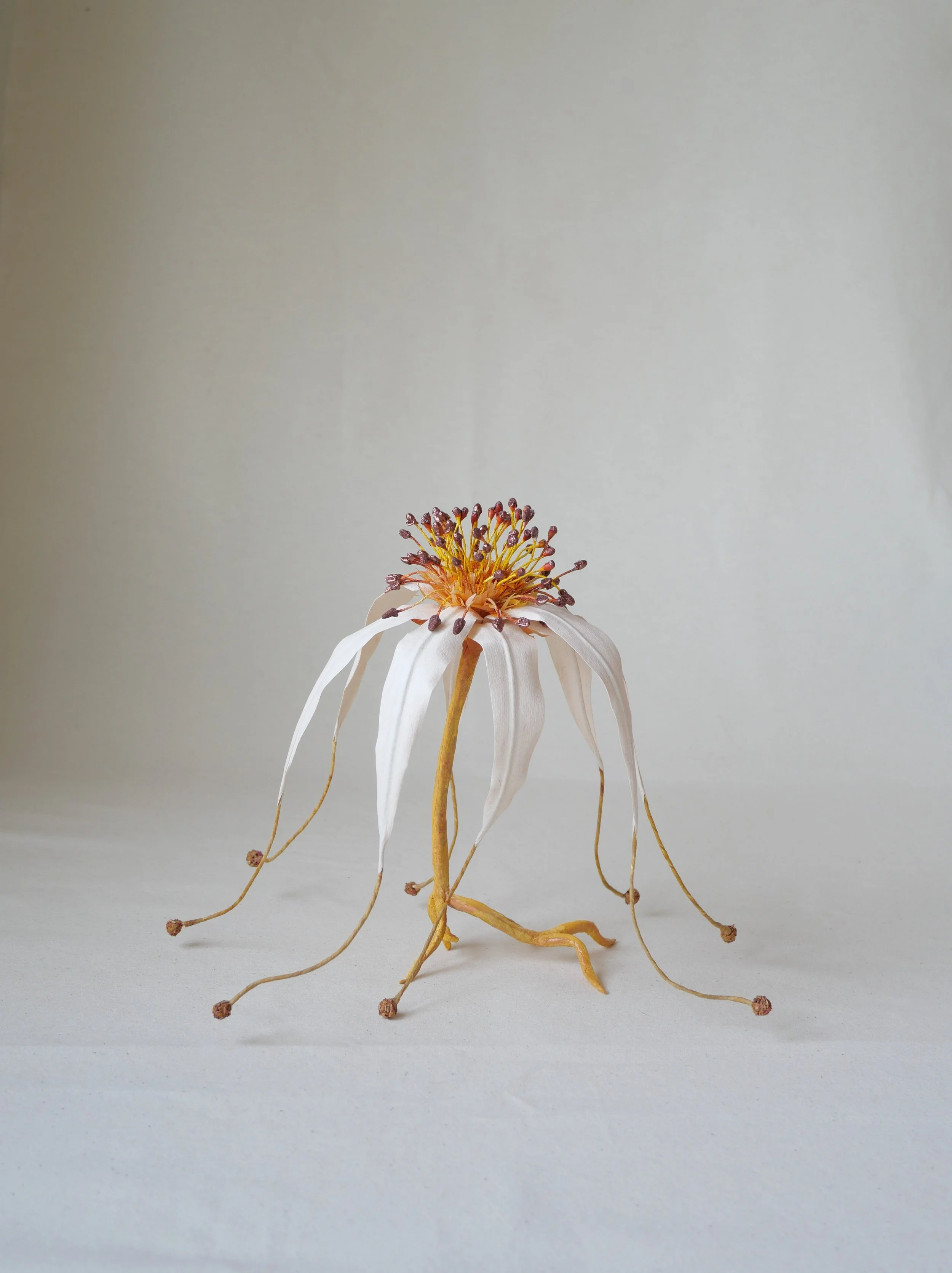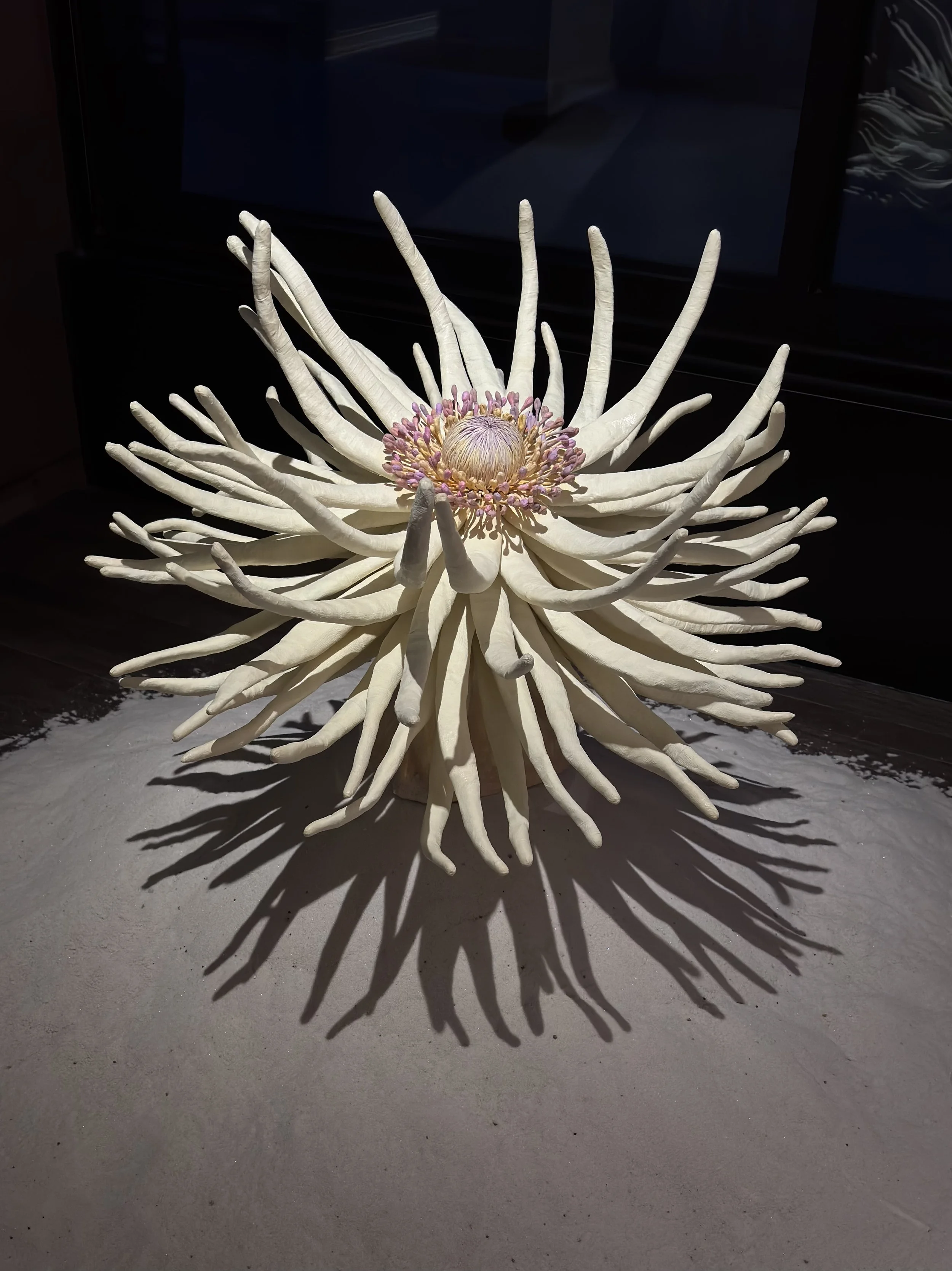 Using storytelling and speculative fiction, Muñoz also debuted a series of sculpture works titled Future Flowers that she made in collaboration with Madrid-based artisanal studio Níkua and artist Indira Sánchez Yiyagami. Using clay, paper, and paint, this delicate sculpture series are flowers with hybrid marine and desert-like characteristics that speculate the form and function of future plant species. Narratively, due to a chimera make-up created by spiritual and material endurance, these creatures have evolved self-autonomy, pride, and consciousness to withstand a variety of extreme travels and environments. Calling it botanical futurism as a framework to think through this transmutation of deep-time re-wilding and resilience, Muñoz shapes the future prime flower (if not already) to be tentacular, centrifugal, and anarchist.