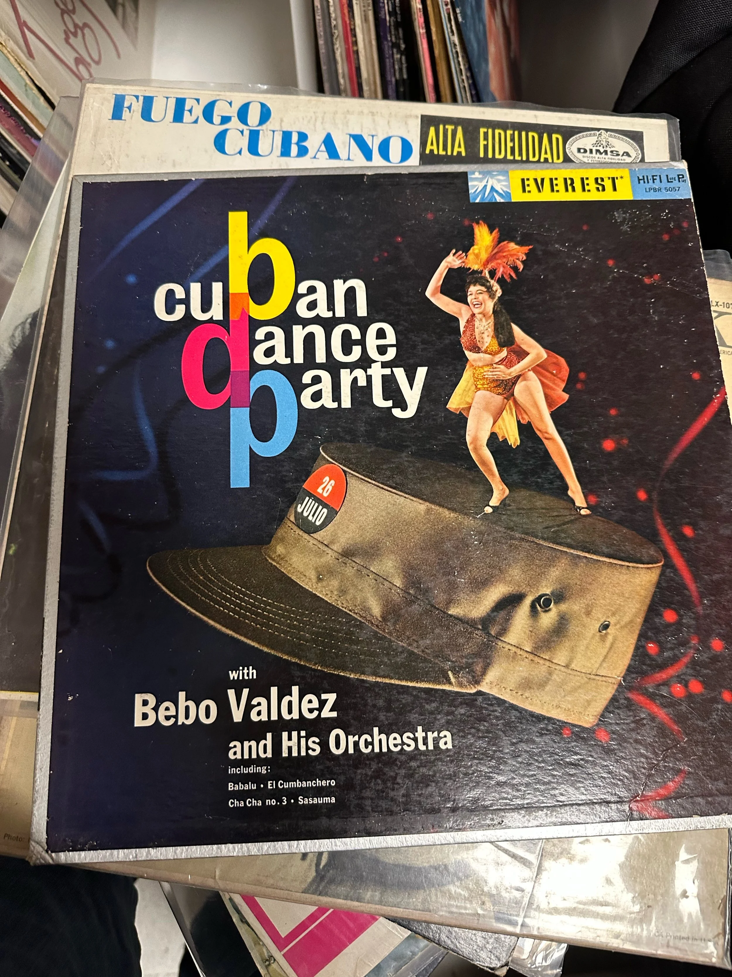 He begins to pull albums out of the stacks and show them to me, with several catching my attention. There was one from Cuban singer Luisa María Hernández, a/k/a La India del Oriente, with those liltingly familiar son guajira songs like “El Fiel Enamorado.” Then there’s the striking cover of a Bebo Valdéz and His Orchestra release “Cuban Dance Party” with a cover depicting what looks like a Hotel Tropicana dancer mamboing on top of a rust-brown military cap with a 26th of July logo, celebrating Castro’s attack on the Moncada barracks in Santiago, which despite failing ultimately became an important date in Cuban revolutionary history celebrated to this day. Gazing at the rare disc, I was temporarily suspended in the irony is that both Valdéz and Celia Cruz (“Guajiro, Llegó tu Día,” with Sonora Matancera) had made records celebrating Castro but soon became two of the revolution’s most famous musical exiles.