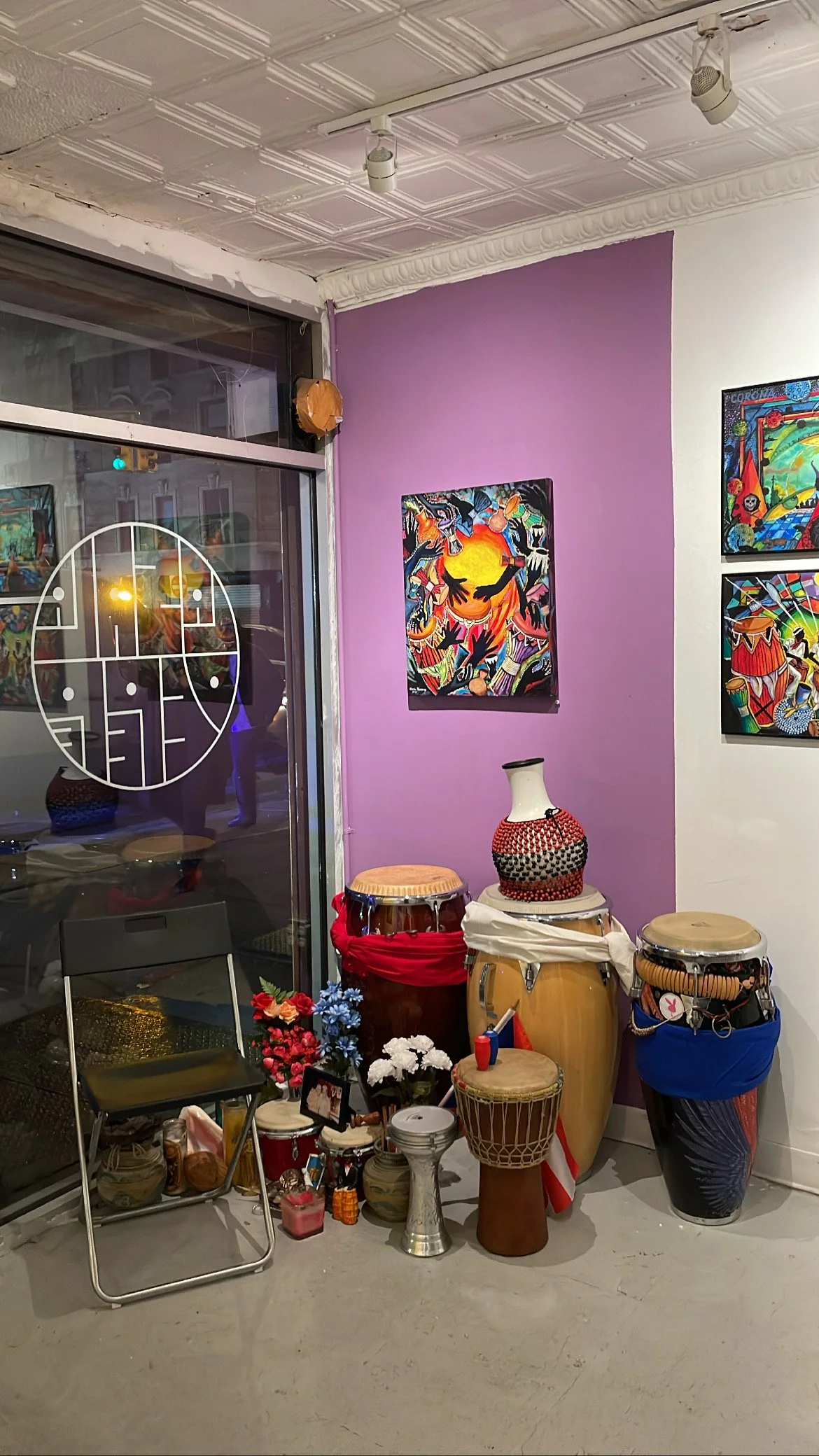 In its 10 months of existence, La Sala de Pepe has hosted or co-produced activities such as “Women in Bomba: Bomba and Beyond,” a Day of the Dead celebration featuring local Mexican musicians and a tribute to David Amram and Jack Kerouac, a “Hurricane María: 5 Years Later” event, “Jangueo y Justicia,” an event about police accountability in Puerto Rico by nonprofit Kilometro Cero, and on February 4th, the opening of an exhibition of works and album cover art by Charlie Rosario called “Dedicated to the Drum: 50 Years of Art and Design.” Pepe had been excited about this show when I had visited weeks earlier, showing me one of Santiago’s standout designs, the cover of Charlie Palmieri’s “Electro Duro,” which featured piano-playing hands carved from metal playing a keyboard of riveted gold and silver keys.