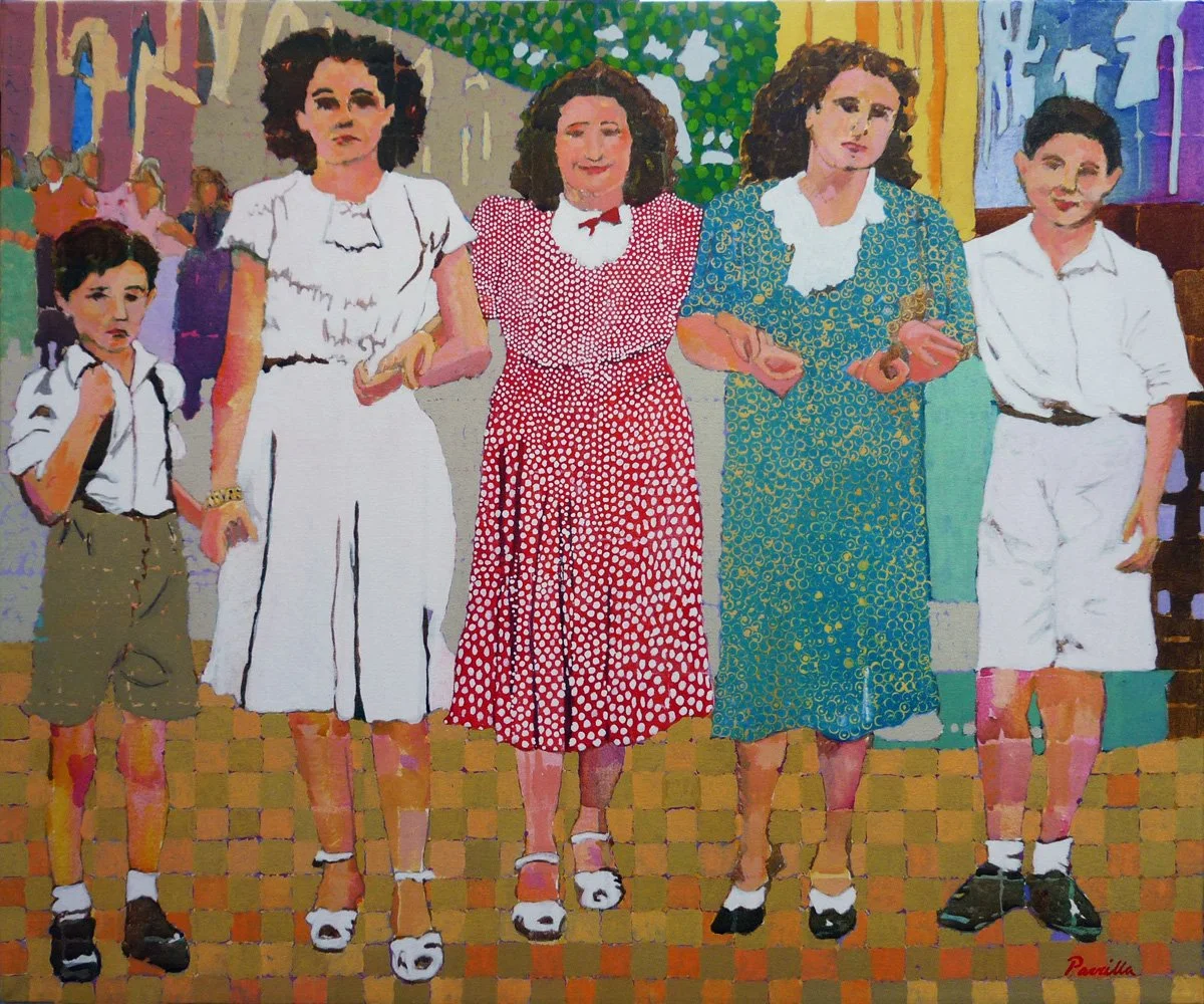 By July 1994, art critic Manuel Alvarez Lezama began to grasp Parrilla’s approach in a review of one of his solo shows. This time, Parrilla uses abstract expressionism and color field techniques to reapproach historical photos, inspired by the discarded photo album of a family named Valentín. “By not painting the faces of these people, and by purposely creating a timeless atmosphere, Parrilla has emptied their referent,” Alvarez Lezama remarked about the Valentín family paintings “This is quite disconcerting and can even cause terror. But it is then that the act of reconstruction begins: It is us in those photographs and they capture our lives.”⁶
