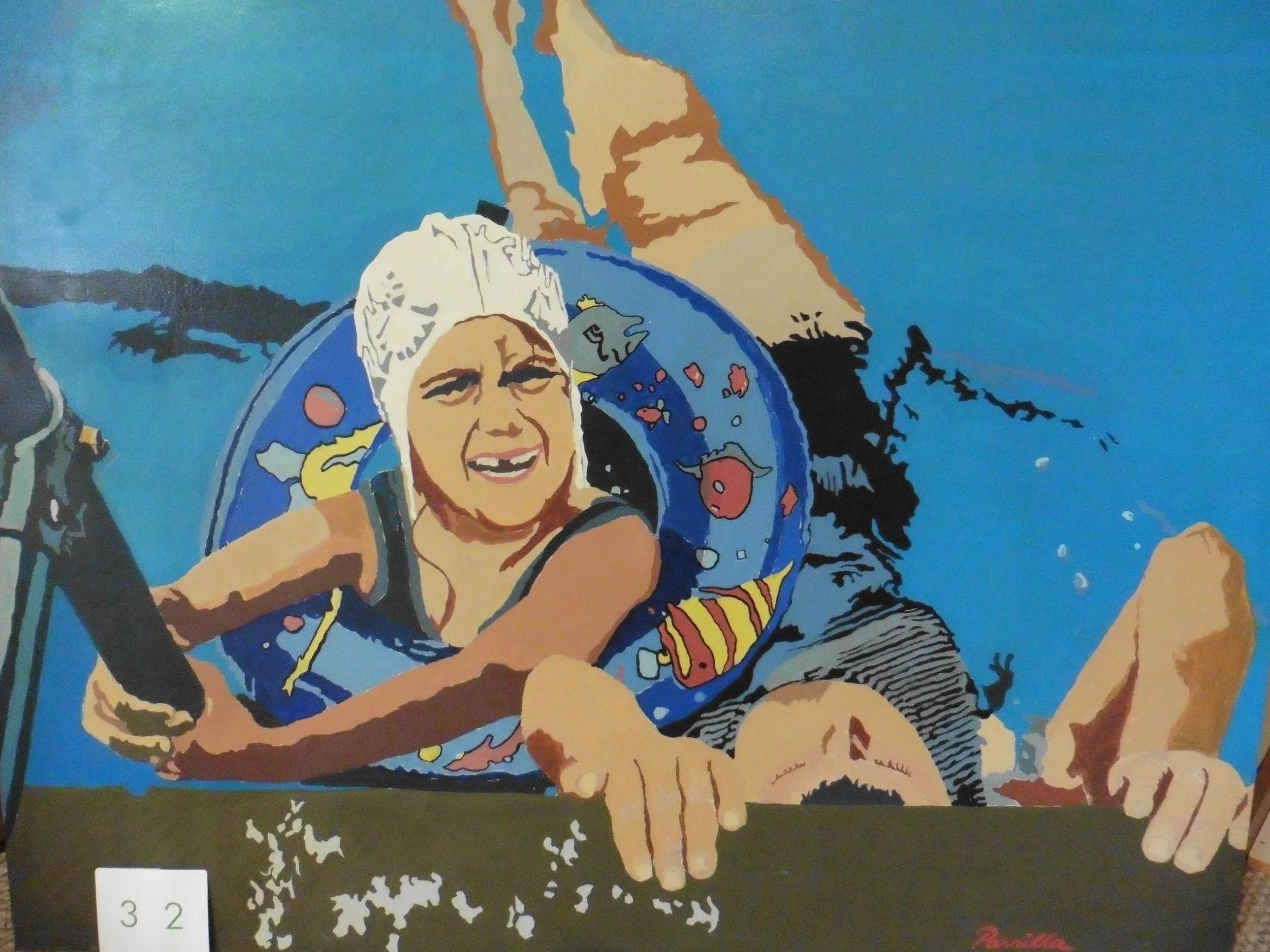 The top of the article displayed a photo of the painter with a desolate face, surrounded by fluttering pigeons, while holding a painting of a young pool swimmer in a pool. The painting is an aqueous memory of Parrilla’s younger sister, Rachel Schwartz floating next to Pino. The variations of shade and light in Schwartz’s and Pino’s skin have a watery quality. The blue chlorinated liquid subtly undulates and diffuses Pino’s swimsuit and legs. Schwartz’s expression is frozen on her face. It is not one of Parrilla’s brushed faces; it shows the proportion and roundness of a child’s face.