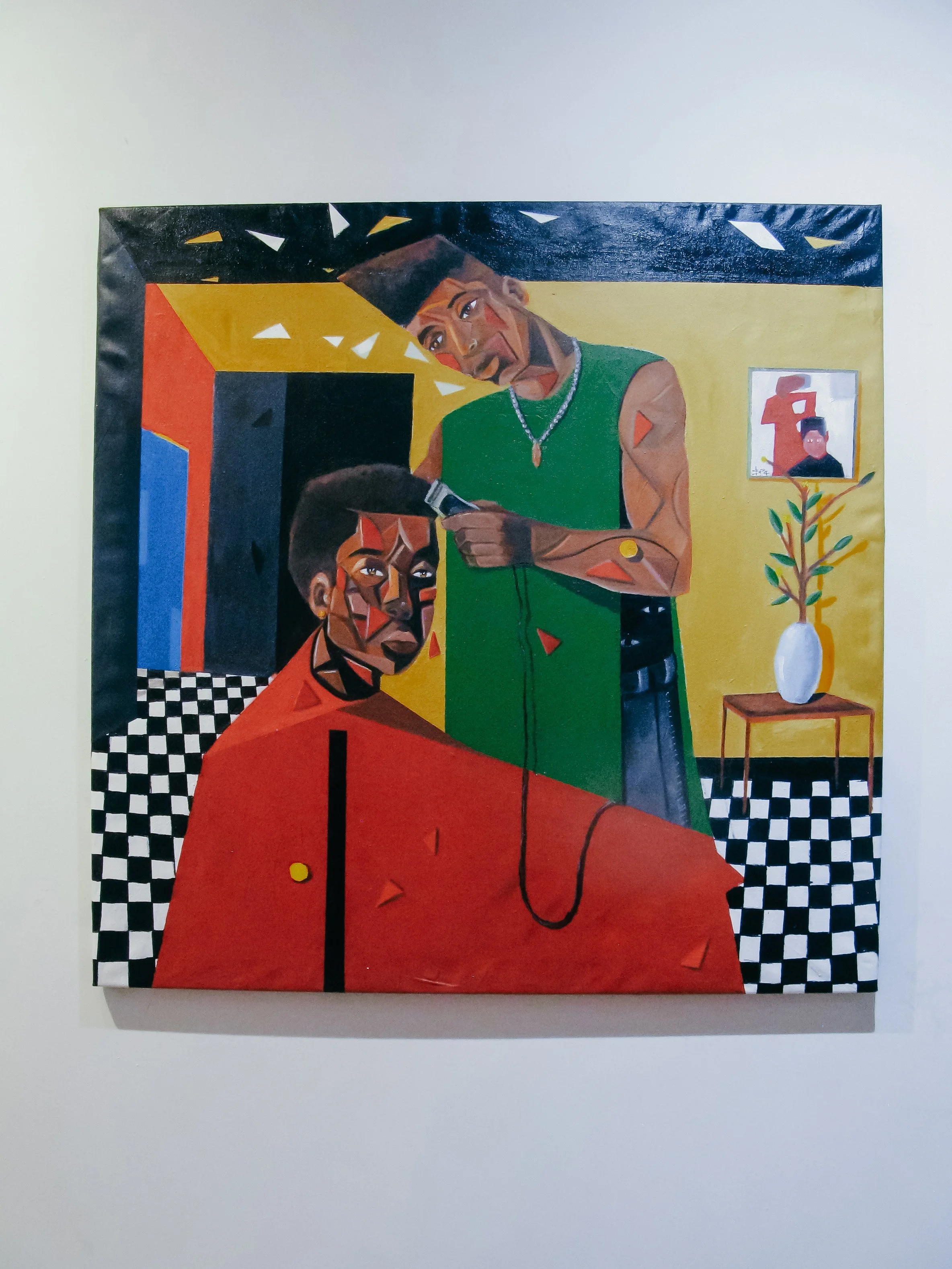 The subtle application of black, green, and red throughout the painting reflects an ancestral call to Pan-Africanism, with Saint-Pierre’s use of color and cubism, historically associated with modern European art. This artwork depicts a scene of a barber and their client, symbolizing the wisdom passed down to generations of clients who have sat in that chair. The sharp angles of the haircut, the meticulous sculpting with clippers, the eyes painted beneath the barber's shirt, and the contemplative expressions on both figures depict stories and histories of Black diasporic peoples in their curated spaces linked to grooming and style.